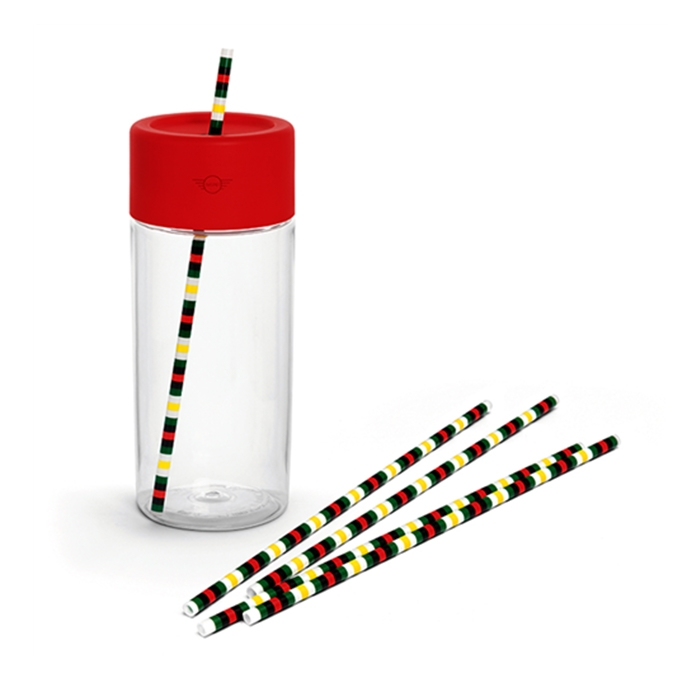 O copo acompanha cinco canudos reutilizáveis listrados, incentivando o uso consciente e sustentável. O logotipo MINI com asas, gravado na parte superior, reforça o apelo exclusivo da marca, acrescentando um toque de sofisticação ao produto.